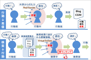 現実世界においてひとが行動する際,人々は多くの感覚を得,そして様々に考え,BlogやCGMなどに情報発信していきます.その発信されたテキストの中に,「静かな」とか「苦味が」とか「バラの香りのような」などのように五感に関する情報が含まれていると我々は考えています.