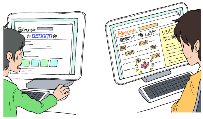 そこで,検索エンジンが返す検索結果のランキングをユーザの「これはいる」「これはいらない」などの意図に沿って動的に再ランキングできるようにする仕組みを提供し,ユーザに検索意図を伝えることを可能とします.